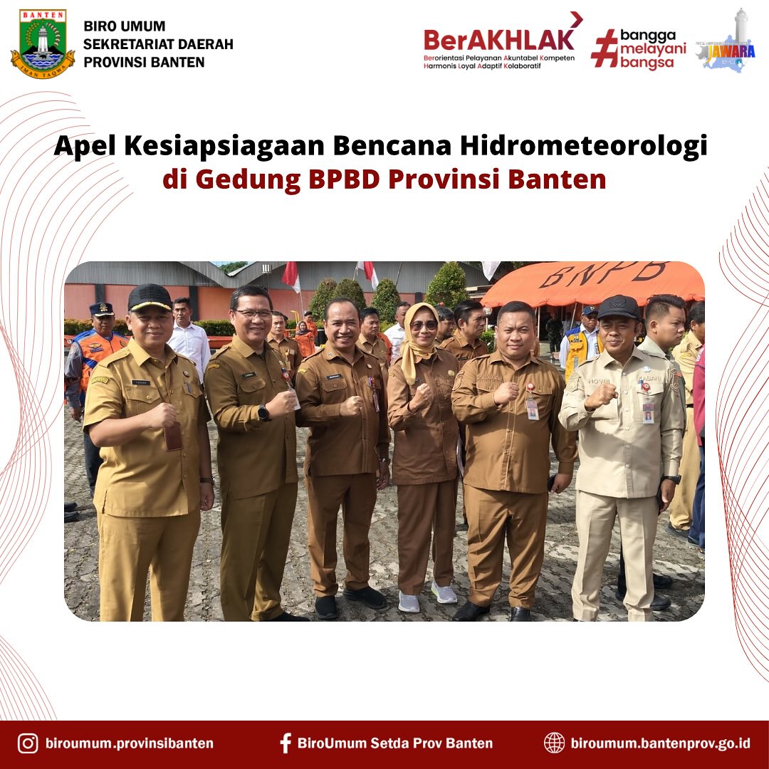 Sumber Gambar : Biro Umum Sekretariat Daerah Provinsi BantenKepala Biro Umum Setda Provinsi Banten, Mohamad Ali Hanapiah, menghadiri kegiatan Apel Kesiapsiagaan Bencana Hidrometeorologi yang digelar di halaman Gedung Badan Penanggulangan Bencana Daerah (BPBD) Provinsi Banten, Senin pagi (24/11). Kegiatan ini diikuti oleh jajaran BPBD, unsur TNI/Polri, relawan kebencanaan, serta berbagai instansi terkait yang terlibat dalam penanganan bencana di wilayah Banten.