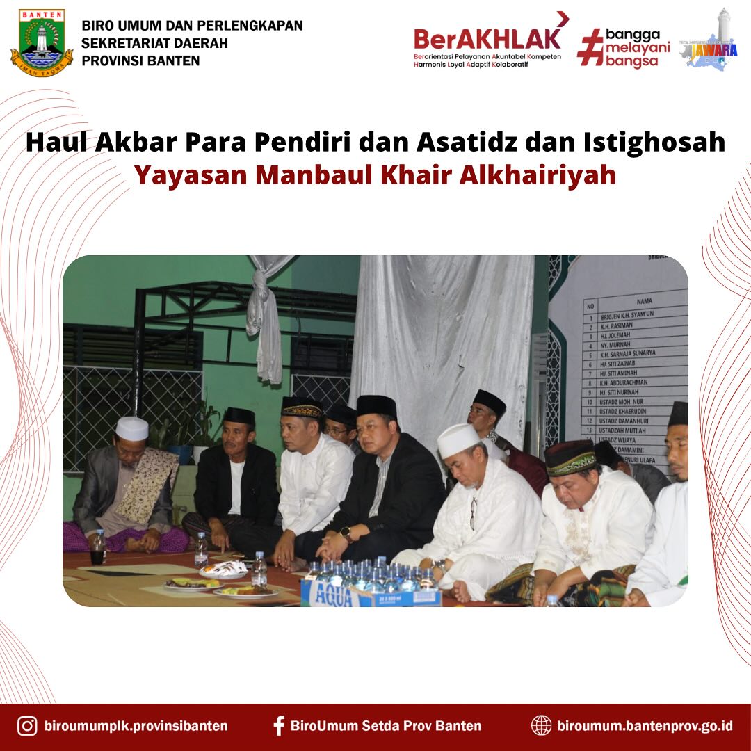 Sumber Gambar : Tim Dokumentasi Biro Umum dan PerlengkapanPadarincang, Serang – Dalam suasana penuh khidmat dan kekeluargaan, acara Haul Akbar para Pendiri dan Asatidz Yayasan Manbaul Khair Alkhairiyah Rancaranji berlangsung pada Jumat, 20 Juni 2025 ini di Komplek Yayasan Manbaul Khaer Alkairiyah Rancaranji Padarincang.