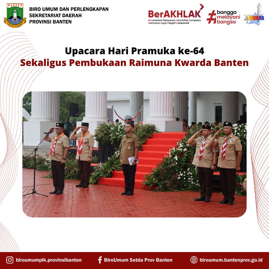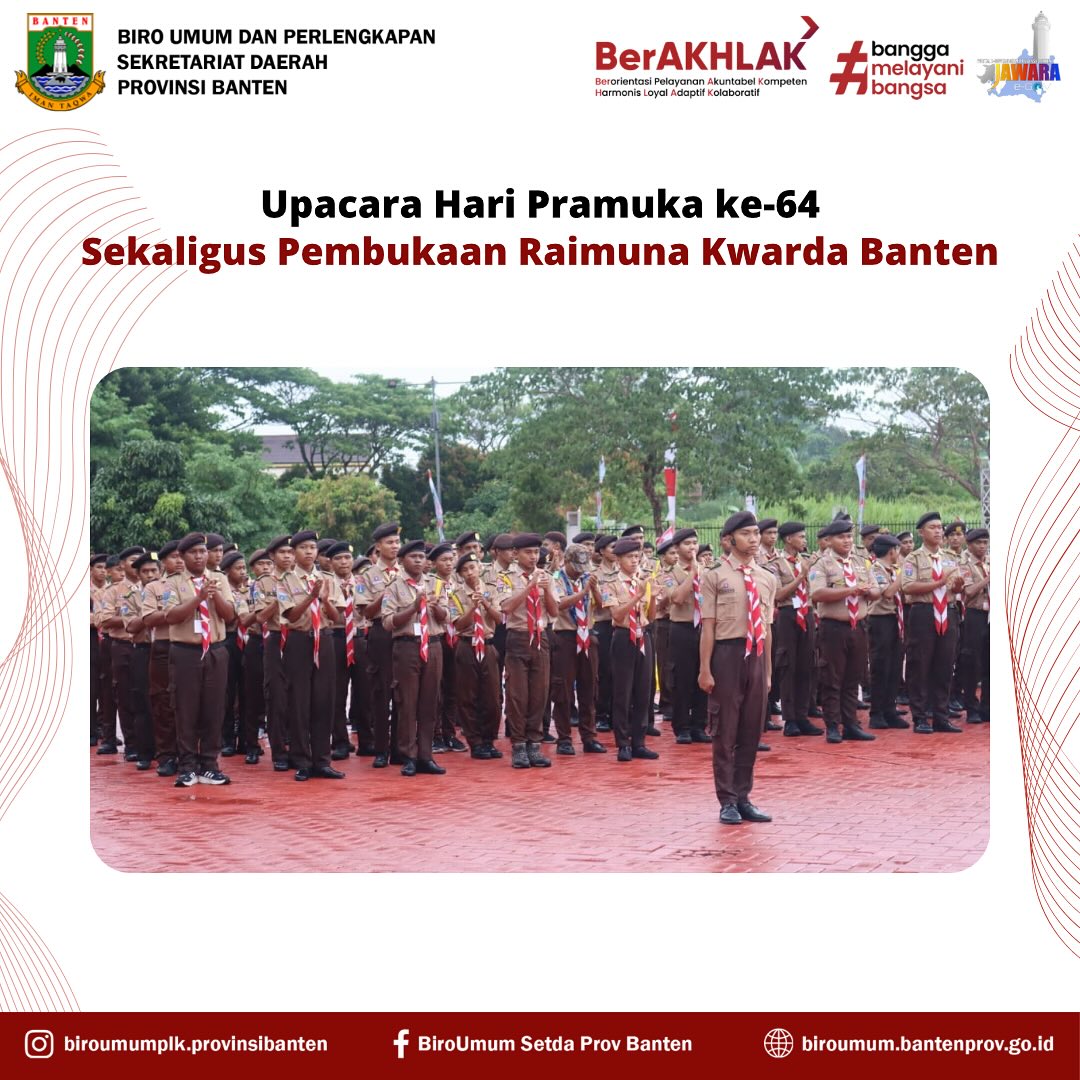 Sumber Gambar : Biro Umum dan Perlengkapan Setda Provinsi BantenSerang (18/8/2025) – Pemerintah Provinsi Banten menggelar Upacara Peringatan Hari Pramuka ke-64 sekaligus pembukaan Raimuna Kwartir Daerah (Kwarda) Banten di Lapangan Upacara Kawasan Pusat Pemerintahan Provinsi Banten (KP3B), Curug, Kota Serang, pada Senin (18/8/2025). Kegiatan ini dijadwalkan berlangsung hingga 21 Agustus 2025.