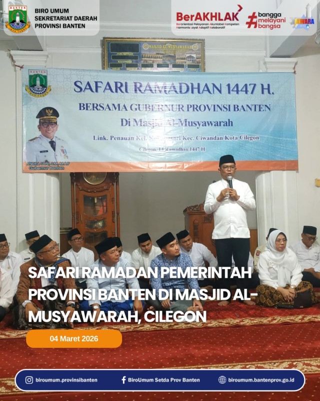 Sumber Gambar : Biro Umum Sekretariat Daerah Provinsi BantenPemerintah Provinsi Banten kembali menggelar Safari Ramadan yang kali ini dilaksanakan di Masjid Al-Musyawarah Cilegon, pada Rabu, 4 Maret 2026.