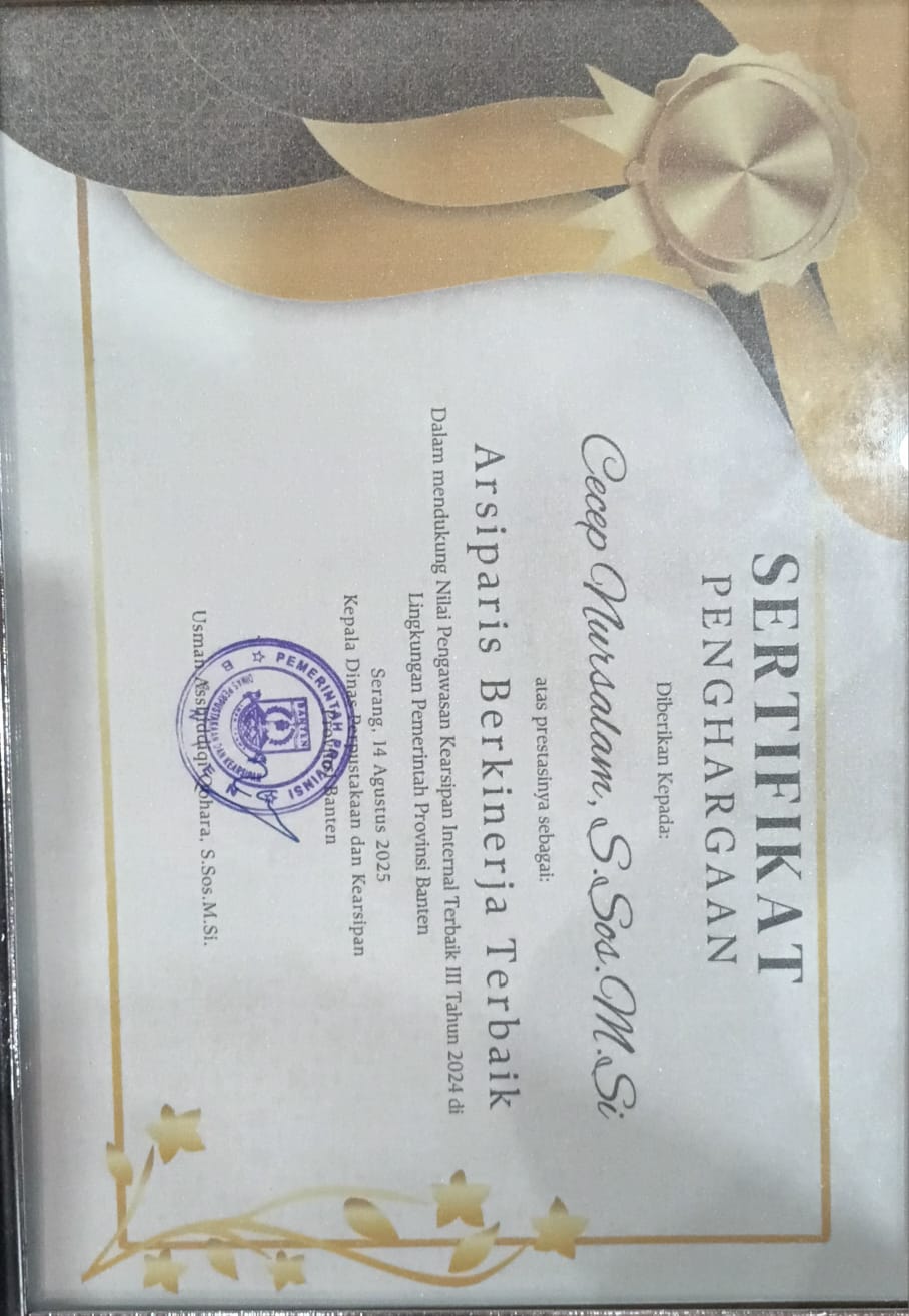 Penghargaan ini merupakan bentuk apresiasi terhadap kinerja arsiparis dalam mendukung pengawasan kearsipan internal perangkat daerah, sekaligus bagian dari upaya meningkatkan tata kelola kearsipan di lingkungan Pemerintah Provinsi Banten.